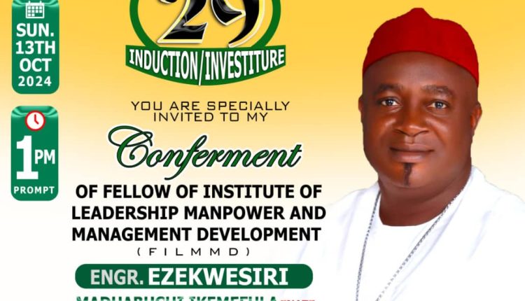 Dear Engr. Ezekwesiri Maduabuchi Ikemefula (FNATA), i profoundly congratulate you on your scheduled induction and investiture as a Fellow of Institute of Leadership Manpower and Management Development (ILMMD) which will hold on the 13th October 2024.