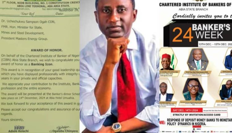 Yet another recognition for the Doyen of Abia Rejoice, Uchechukwu Sampson Ogah PhD, (CON), FCA, Honoured by The Chartered Institute of Bankers of Nigeria, Abia State branch, as a banking ICON at a dinner and lecture in commemoration of 2024 Bankers Week held yesterday 14th December at Abia Hotels, Umuahia.