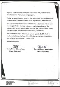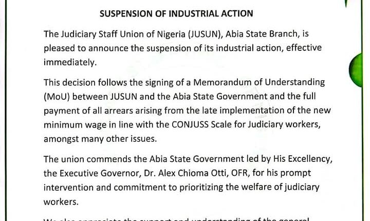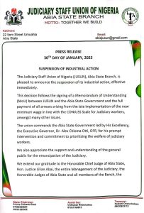 The Abia State Judiciary Staff Union of Nigeria, Abia State Chapter suspends strike.