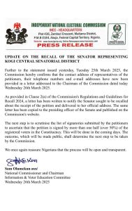 UPDATE ON THE RECALL OF THE SENATOR REPRESENTING KOGI CENTRAL SENATORIAL DISTRICT