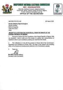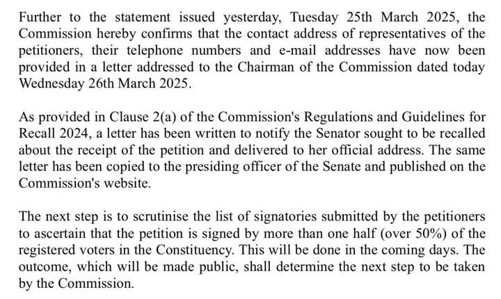 As provided in Clause 2(a) of the Commission’s Regulations and Guidelines for Recall 2024, a letter has been written to notify the Senator sought to be recalled about the receipt of the petition and delivered to her official address. The same letter has been copied to the presiding officer of the Senate and published on the Commission’s website.