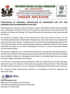 As provided in Section 29(3) of the Electoral Act 2022 and listed as item 4 on the Timetable and Schedule of Activities for the election, the Commission has published the personal particulars of each candidate and his running mate by displaying copies of the Form EC9, along with all the accompanying academic credentials and other documents submitted by them, at our State Headquaters and the 21 Local Government offices across Anambra State.