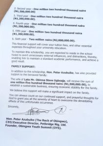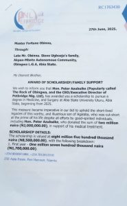 Hon. Peter Azubuike, (popularly known as the ROCK), the CEO/Executive Director of Petbrigde Nig. Ltd has awarded Scholarship/family support to the family of Late Obinna Ugboaja to pursue a degree in medicine and surgery at the Abia State University, Uturu, beginning from 2025.