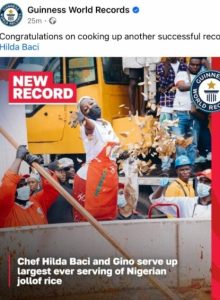 A photograph shared by Guinness World Records showed Baci, clad in her apron and surrounded by her team, stirring the record-breaking pot while smiling and tossing food into the air. The caption read: “Chef Hilda Baci and Gino serve up largest ever serving of Nigerian jollof rice.”